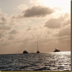The restaurant chef was going to prepare the abundance of mahi caught in a variety of ways and we were invited to join the fishermen and their wives for dinner. We declined dinner but agreed to come back for a drink afterwards. Our dingy was tied near the area where the sharks ate dinner so we waited until we were sure they left the area before climbing down the ladder.The thought of becoming dessert in the event one of us slipped on our climb down made for a very slow and careful decent